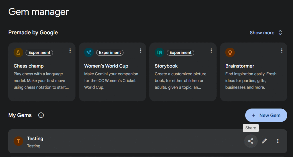 4) Click on the “Share” button if you want to give access to certain users or anyone with the link. In most cases, you will want to do some testing before sharing it. You can share gems anytime you want by clicking on the share icon in the “Gem manager” page.